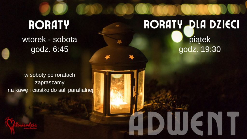 Celebrujmy adwentowe oczekiwanie wraz z całym Kościółem i Najświętszą Dziewicą Maryją uczestnicząc w Mszach św. Roratnich, które w naszym kościele odbywać się będą od wtorku do soboty o godzinie 6:45; a także w Roratach dla dzieci w piątek o 19:30. Bezpośrednio przed Roratami o 6:30 będziemy modlić się Godzinkami ku czci Matki Bożej.