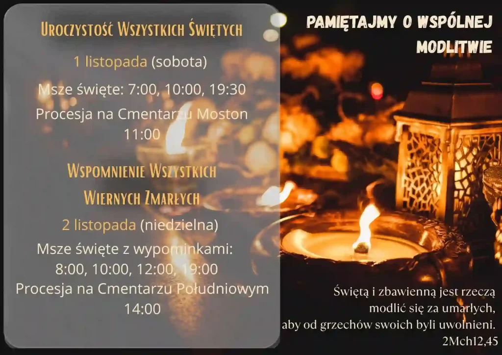 1 listopada w Uroczystość Wszystkich Świętych zapraszamy na uroczyste Msze święte o godzinie 7:00, 10:00 i 19:30. Tego dnia odbędzie się o godzinie 11:00 tradycyjna procesja i modlitwa na Cmentarzu w Moston.
